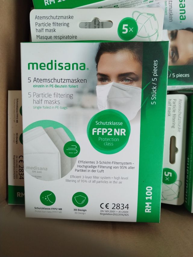 Mascarillas nuevas a estrenar medisana 5 unidades por caja hay 75 cajas fp2