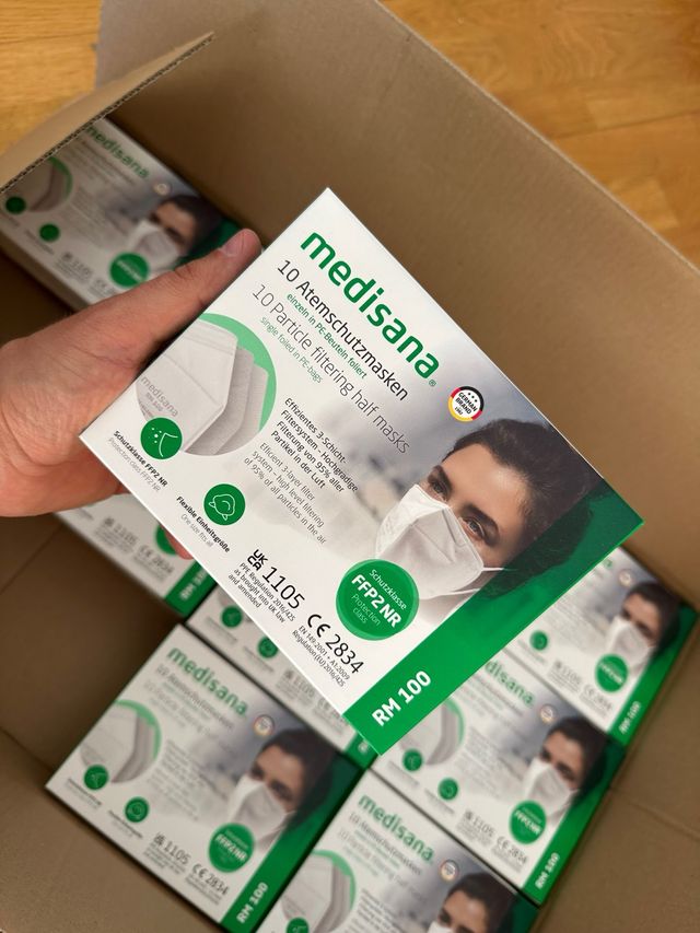 Caja de 10 mascarillas de protección FFP2 NR de la marca Medisana. Vienen empaquetadas individualmente en bolsas de PE.