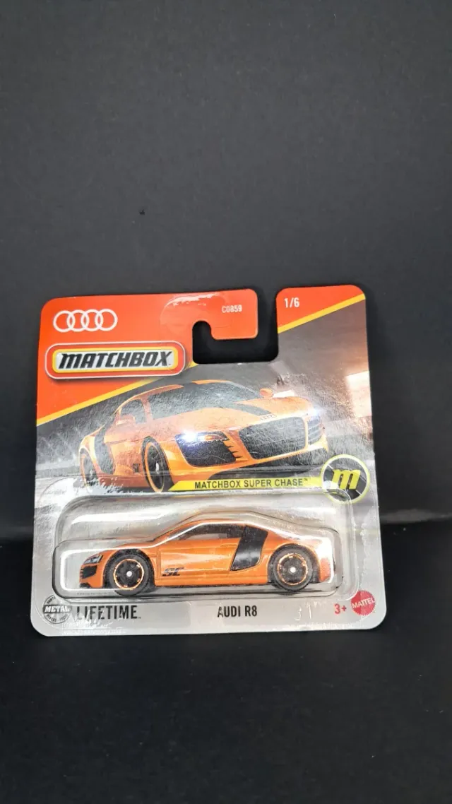 Coche de colección Matchbox Audi R8 Super Chase. - Modelo a escala. - Color naranja con detalles en negro. - Ruedas con detalles en naranja.