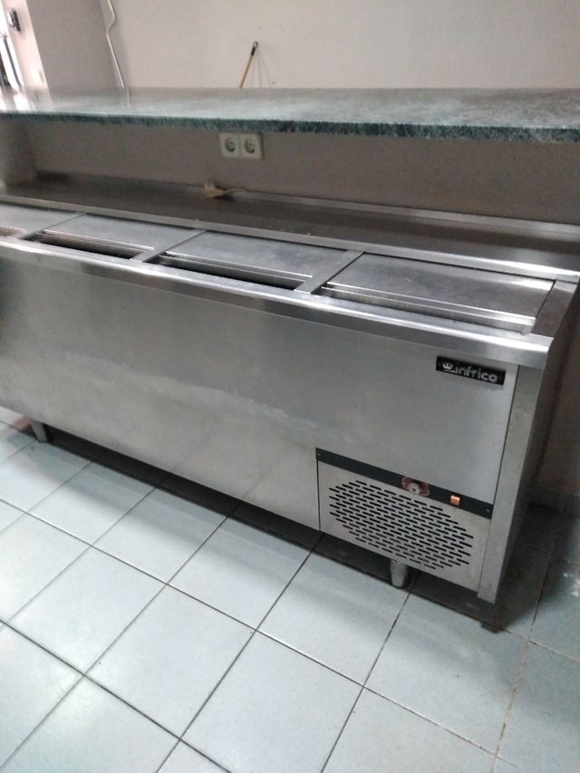 Detalles del productoParticular vendo lote de hostelería : 1 vitrina expositora para las pastas ( nueva ) 1 vitrina expositora para las tapas marca Sayl ( nueva )1 chocolatera marca Fairy ( nueva ), 1 campana extractora de inox tipo doméstico, 4 extintores, 1 barbacoa eléctrica adaptada, 1 nevera Infrico dos puertas ( para reparar, falta gas ) 1 botellero de cuatro marca Infrico, 1 horno Teka, 28 sillas interior, 15 sillas de aluminio, 3 mesas redondas inox., 4 mesas grandes cuadradas de inox., 1 mesa alta redonda inox. con base negra ( nueva ) 7 mesas, 11 taburetes inox. con base negra., copas, platos, paellas, 4 extintores, etc.Precio a negociar.