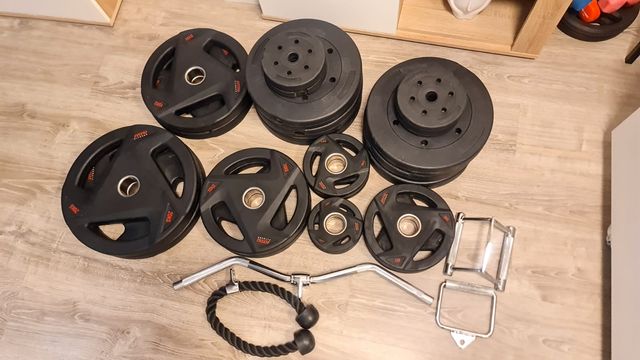 - Discos de diferentes pesos. 2 tipos de calidad; 60 kilos de discos de arena 10x6 y los otros nose de que material son pero son muy buenos para barra olimpica.