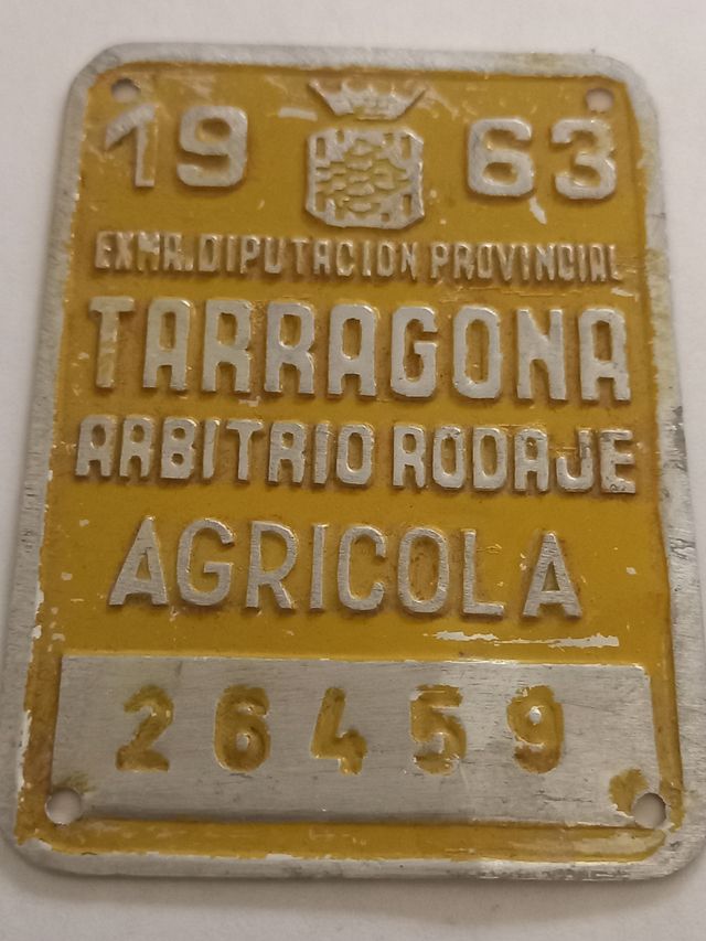 Matricula de chapa, Agrícola de Tarragona del año 1963. Medidas aprox. 5 x 7 cm.