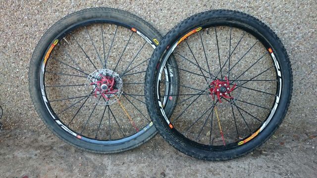 Detalles del productoRuedas de 26 mavic crossmax slr 2009. La trasera se fisuro por el agujero de la valvula, fisura tipica de mavic, y esta reparada con fibra de carbono, de ahi su precio.. La reparacion no se ve, esta por la parte de dentro de la garganta como se ve en la foto. 100% tubeless, sin cinta, no pierden nada de aire.