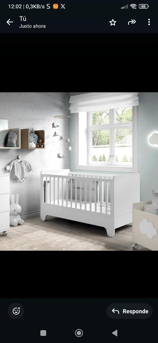 Detalles del productoPreciosa cuna de bebé de 77x146 cm, ideal para que tu pequeño descanse plácidamente. Tiene 2 barandillas fijas y 3 alturas de somier. Es un modelo evolutivo, adaptándose a las necesidades de tu hijo a medida que crece, ya que se convierte en camita. Precio original 450 euros. Está como nueva, con una pequeñísima marca de la sujeción de un juguete (ver fotos).