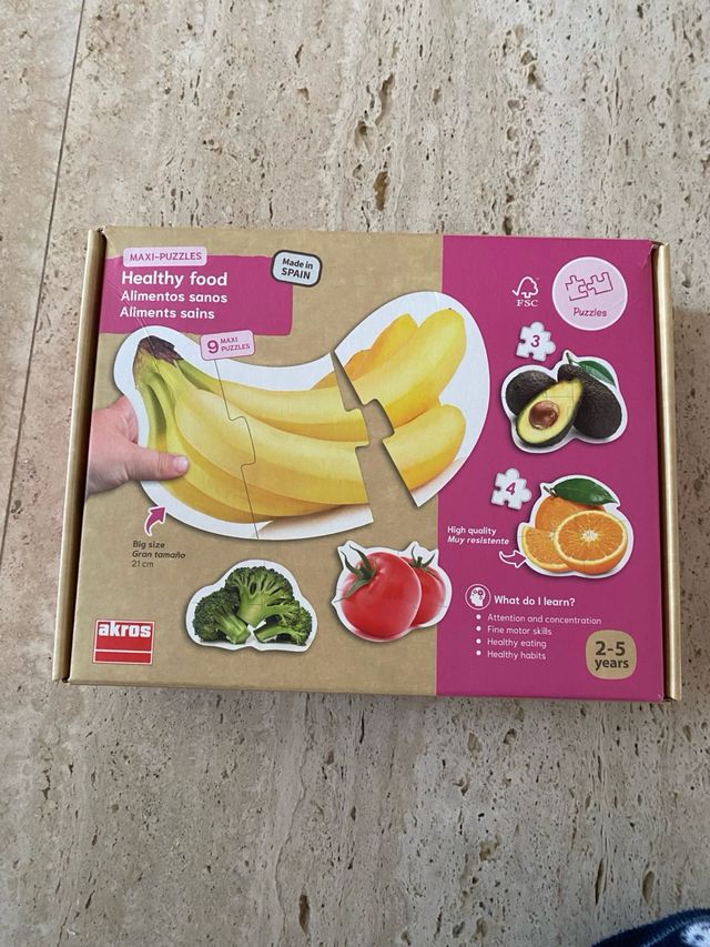 Detalles del productoSet de puzzles Maxi de Akros con temática de comida saludable. Incluye 9 puzzles de 3 y 4 piezas grandes.