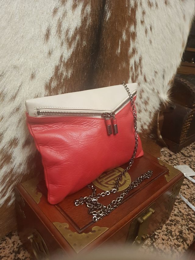 Bolso rojo y blanco roto tipo sobre, de mano o bandolera,, piel autentica, medidas 27 x18, ideal fiesta, o diario,