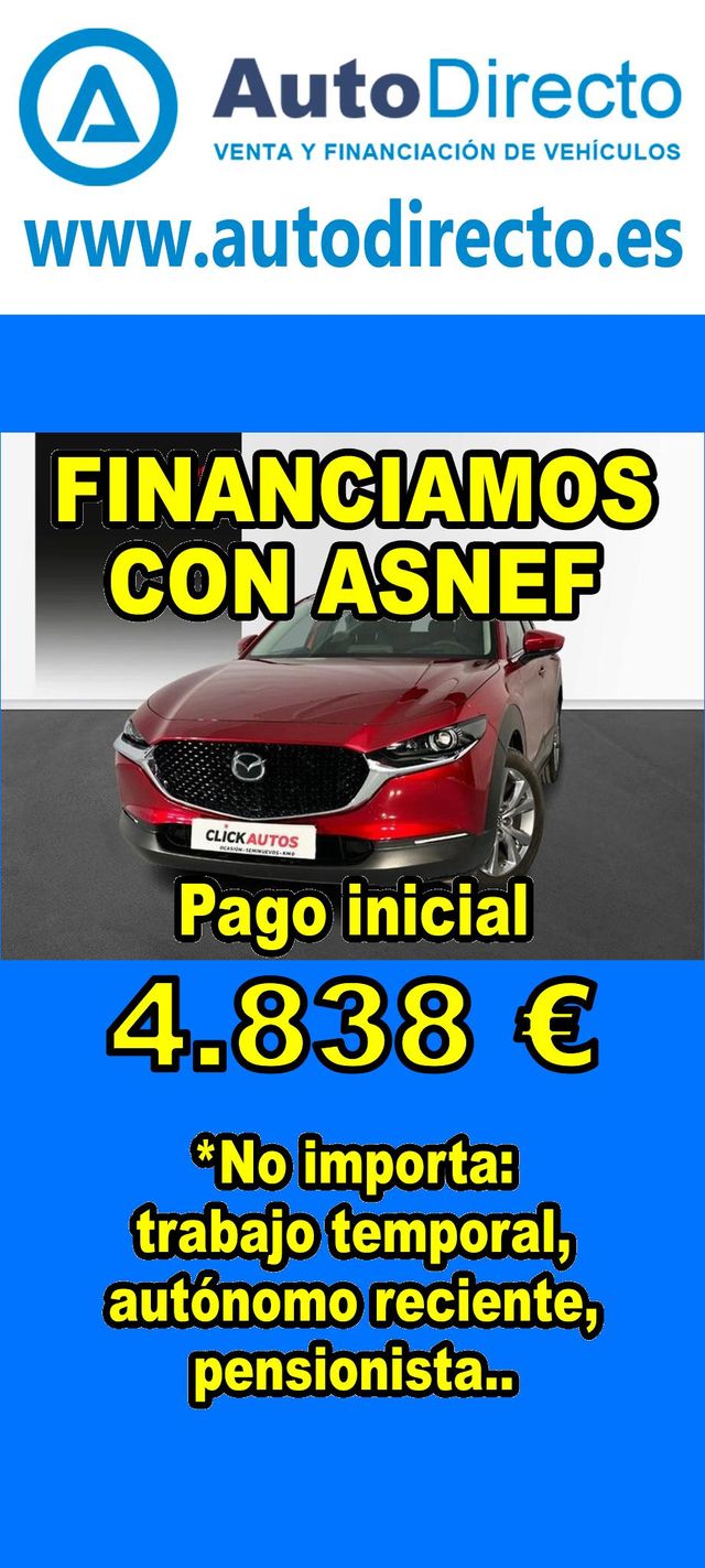 Detalles del producto¿No consigues financiación? ¡Tenemos la solución! *************************************************************************** RENT CREDIT: Aprobamos más del 90% de las operaciones. No importa ASNEF o RAI, impagos pendientes, ser autónomo o empresa reciente, ser pensionista. Imprescindible pago inicial del 20%. Ejemplo de operación: MAZDA CX-30 2.0 E-SKYACTIV 122CV MHEV ZENITH + PACK BOSE. Ref. W957549MGG - Precio vehículo financiado: 24190 €. - Pago inicial de 4838 €. - Cuota mes desde 503 €. - Impuesto de circulación y garantía (mínimo 1 año) incluidos. *************************************************************************** ✅ Más de 3.000 COCHES Y FURGONETAS EN STOCK. ✅ HASTA 2 AÑOS DE GARANTIA. ✅ Kilómetros certificados. ✅ 17 concesionarios repartidos en toda España. ♻️ Aceptamos tu coche como parte del pago. *************************************************************************** IMPORTANTE: -. Este anuncio, no es vinculante, puede contener errores. SE MUESTRAN A TÍTULO INFORMATIVO Y NO CONTRACTUAL. -. Consultar disponibilidad del vehículo y datos exactos: fecha de matriculación, importes, etc,... *************************************************************************** Te ofrecemos distintas opciones: financiación, renting, alquiler con opción a compra, rent credit. En nuestro stock disponible encontraras: 3008 , qashqai , corolla , rav4 , sandero , Duster , yaris , 2008 , Tucson , Ibiza , 208 , Sportage , a3 , c4 , Formentor , q3 , yaris cross , 500 , c3 , arona , zs , x1 , kona , corsa , clase a , león , 308 , serie 1 , golf , focus , captur , a1 , tiguan , i20 , t roc , stonic , xc40 , civic , q5 , serie 3 , glb , 5008 , ateca , clio , kuga , c hr , i30 , arkana , juke , a4 , x3 , cx 5 , xc60 , kamiq , taigo , Mustang , x6 , polo , ceed , karoq , x2 , Astra , niro , cx 30 , a5 , cooper , megane , moka , fiesta , hs , q2 , clase c , serie 3 , renegade , picanto.