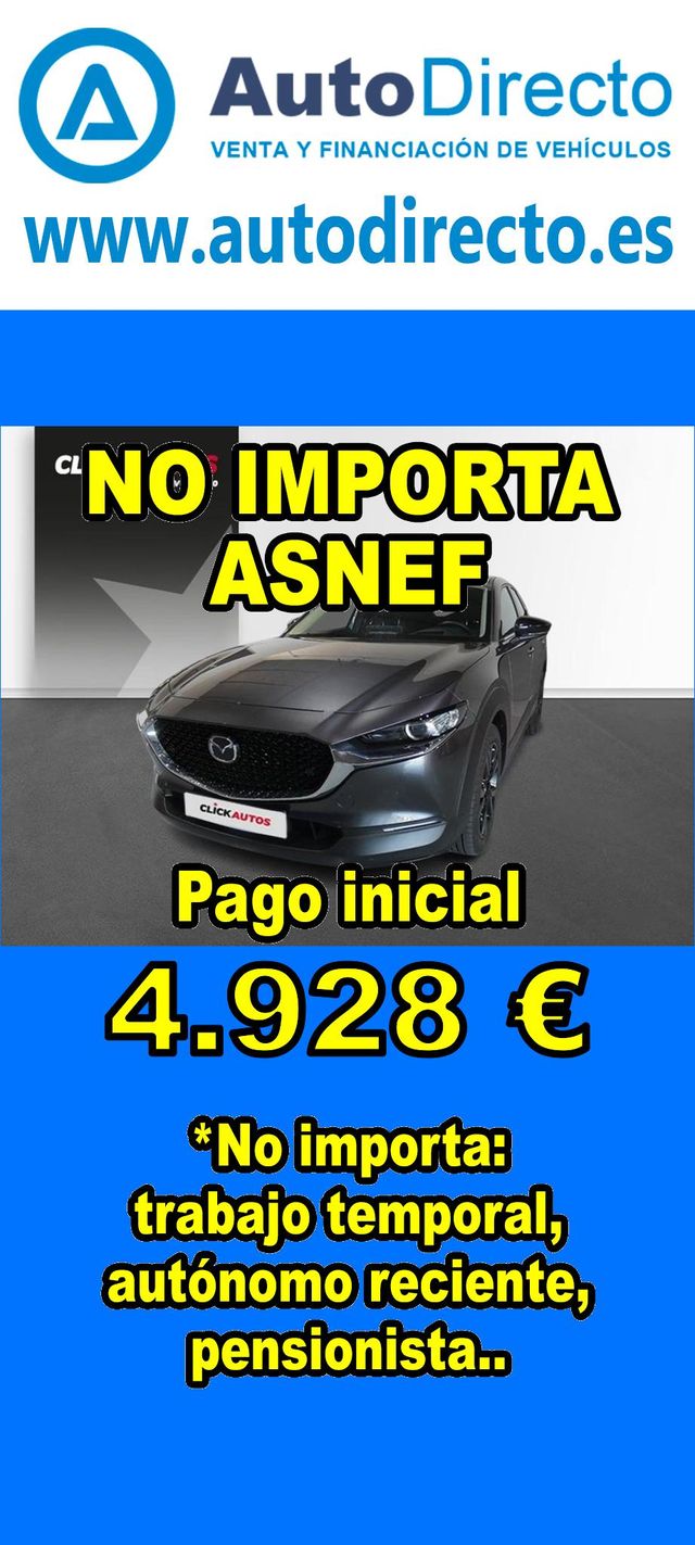 Detalles del producto¿No consigues financiación? ¡Tenemos la solución! RENT CREDIT (Alquiler con opción a compra) *************************************************************************** Aprobamos más del 90% de las operaciones. No importa ASNEF o RAI, impagos pendientes, ser autónomo o empresa reciente, ser pensionista. Imprescindible aportación inicial del 20%. Ejemplo de operación: MAZDA CX-30 2.0 E-SKYACTIV G 122CV MHEV HOMURA AT. Ref. W959320MST - Precio vehículo: 24640 €. - Aportación inicial de 4928 €. - Cuota mes desde 512 €. - Impuesto de circulación y garantía de 1 año incluidos. *************************************************************************** ✅ Más de 3.000 VEHÍCULOS EN STOCK. ✅ Kilómetros certificados. ✅ 17 concesionarios repartidos en toda España. ♻️ Aceptamos tu coche como parte de la operación. *************************************************************************** IMPORTANTE: -. Este anuncio, no es vinculante, puede contener errores. SE MUESTRAN A TÍTULO INFORMATIVO Y NO CONTRACTUAL. -. Consultar disponibilidad del vehículo y datos exactos: fecha de matriculación, importes, etc,... *************************************************************************** Te ofrecemos distintas opciones: Venta al contado, financiación, renting, RENT CREDIT (Alquiler con opción a compra).