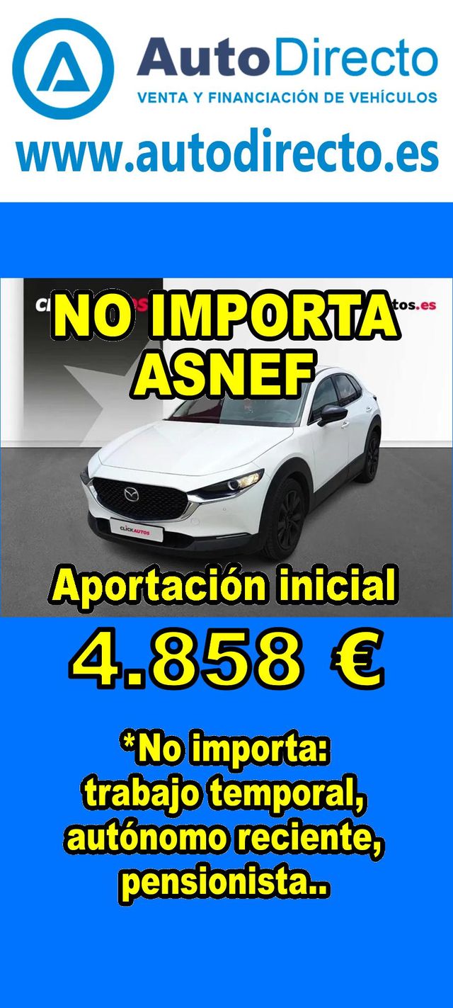 Detalles del producto¿No consigues financiación? ¡Tenemos la solución! RENT CREDIT (Alquiler con opción a compra) *************************************************************************** ✅ Aprobamos más del 95% de las operaciones. ✅ No importa ASNEF o RAI, impagos pendientes, ser autónomo o empresa reciente, ser pensionista. \\n ✅ Imprescindible aportación inicial del 20%. ✅ Ejemplo de operación: MAZDA CX-30 2.0 E-SKYACTIV G 122CV MHEV HOMURA AT. Ref. W950739MTC - Precio vehículo: 24290 €. - Aportación inicial de 4858 €. - Cuota mes desde 505 €. ✅ Impuesto de circulación y garantía de 1 año incluidos. *************************************************************************** ✅ Más de 3.000 VEHÍCULOS EN STOCK. ✅ Kilómetros certificados. ✅ 17 concesionarios repartidos en toda España. ♻️ Aceptamos tu coche como parte de la operación. *************************************************************************** IMPORTANTE: -. Este anuncio, no es vinculante, puede contener errores. SE MUESTRAN A TÍTULO INFORMATIVO Y NO CONTRACTUAL. -. Consultar disponibilidad del vehículo y datos exactos: fecha de matriculación, importes, etc,... *************************************************************************** Te ofrecemos distintas opciones: Venta al contado, financiación, renting, RENT CREDIT (Alquiler con opción a compra).
