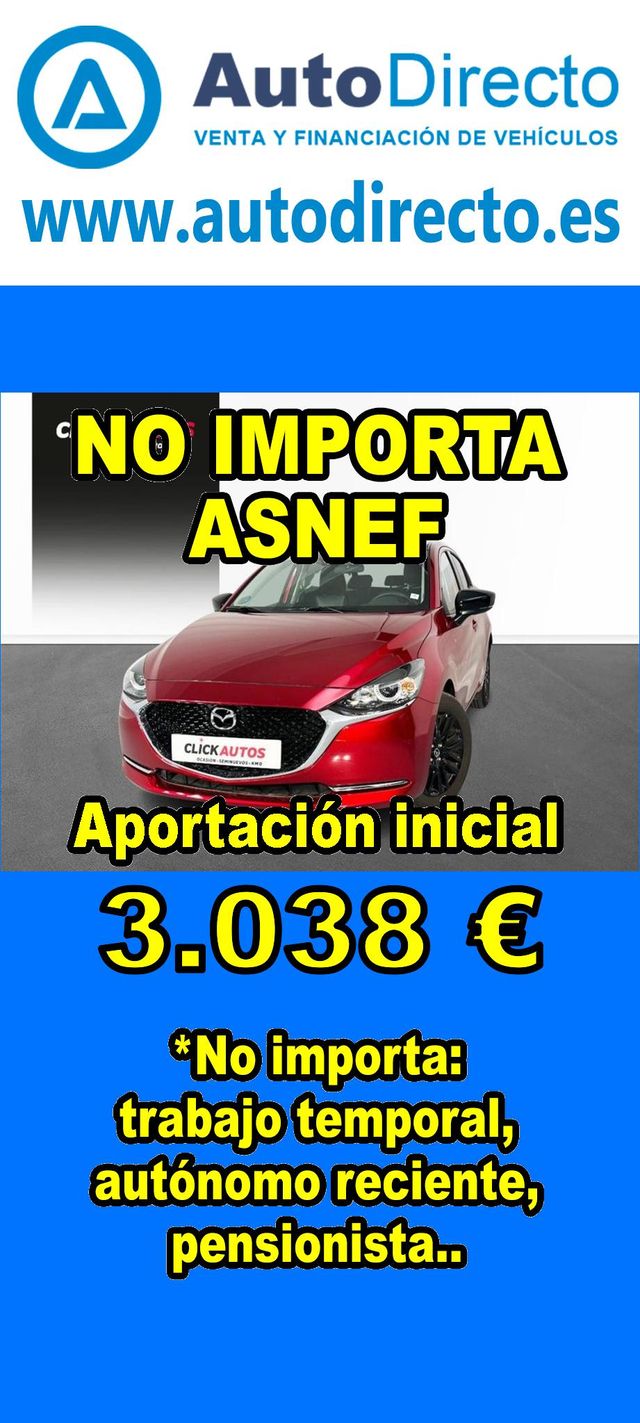 Sin valoracionesDetalles del producto¿No consigues financiación? ¡Tenemos la solución! RENT CREDIT (Alquiler con opción a compra) *************************************************************************** ✅ Aprobamos más del 95% de las operaciones. ✅ No importa ASNEF o RAI, impagos pendientes, ser autónomo o empresa reciente, ser pensionista. \\n ✅ Imprescindible aportación inicial del 20%. ✅ Ejemplo de operación: MAZDA MAZDA2 2 1.5 E-SKYACTIV 90CV MHEV MT HOMURA. Ref. W956722MFB - Precio vehículo: 15190 €. - Aportación inicial de 3038 €. - Cuota mes desde 320 €. ✅ Impuesto de circulación y garantía de 1 año incluidos. *************************************************************************** ✅ Más de 3.000 VEHÍCULOS EN STOCK. ✅ Kilómetros certificados. ✅ 17 concesionarios repartidos en toda España. ♻️ Aceptamos tu coche como parte de la operación. *************************************************************************** IMPORTANTE: -. Este anuncio, no es vinculante, puede contener errores. SE MUESTRAN A TÍTULO INFORMATIVO Y NO CONTRACTUAL. -. Consultar disponibilidad del vehículo y datos exactos: fecha de matriculación, importes, etc,... *************************************************************************** Te ofrecemos distintas opciones: Venta al contado, financiación, renting, RENT CREDIT (Alquiler con opción a compra).