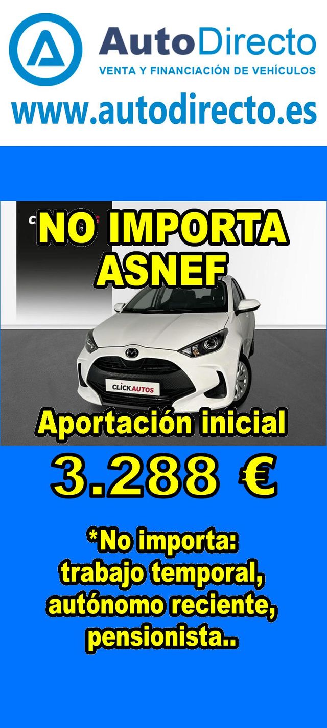 Sin valoracionesDetalles del producto¿No consigues financiación? ¡Tenemos la solución! RENT CREDIT (Alquiler con opción a compra) *************************************************************************** ✅ Aprobamos más del 95% de las operaciones. ✅ No importa ASNEF o RAI, impagos pendientes, ser autónomo o empresa reciente, ser pensionista. \\n ✅ Imprescindible aportación inicial del 20%. ✅ Ejemplo de operación: MAZDA MAZDA2 2 1.5 HYBRID 116CV VVT-I PURE AUTO. Ref. W955614MKY - Precio vehículo: 16440 €. - Aportación inicial de 3288 €. - Cuota mes desde 345 €. ✅ Impuesto de circulación y garantía de 1 año incluidos. *************************************************************************** ✅ Más de 3.000 VEHÍCULOS EN STOCK. ✅ Kilómetros certificados. ✅ 17 concesionarios repartidos en toda España. ♻️ Aceptamos tu coche como parte de la operación. *************************************************************************** IMPORTANTE: -. Este anuncio, no es vinculante, puede contener errores. SE MUESTRAN A TÍTULO INFORMATIVO Y NO CONTRACTUAL. -. Consultar disponibilidad del vehículo y datos exactos: fecha de matriculación, importes, etc,... *************************************************************************** Te ofrecemos distintas opciones: Venta al contado, financiación, renting, RENT CREDIT (Alquiler con opción a compra).