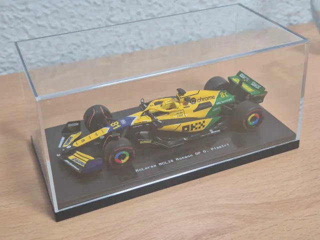Réplica detallada del coche de Fórmula 1 McLaren MCL38, edición especial Monaco GP O. Piastri. - Escala 1:43. - Diseño con librea amarilla y verde. - Base expositora incluida.