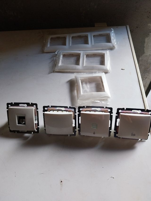15 und Pulsador con luz y dibujo ( 5€ ) 8 und Pulsador con dibujo timbre ( 3.5€ ) 2 und Interruptores dobles 5 und Toma tlf 137 unds Marco 1 elemento ( 1€ ) Marco 3 elementos ( 3€ ) Marco 4 elmementos ( 4€ )