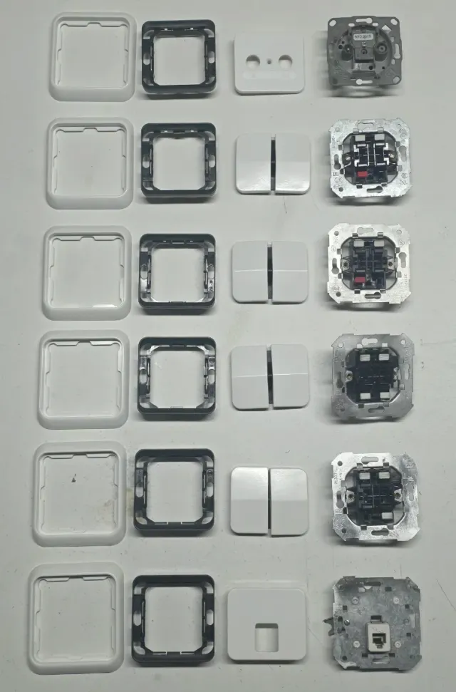 Detalles del productoConjunto de mecanismos Simón 75, ideales para instalaciones eléctricas. Se incluyen varias piezas para diferentes configuraciones.