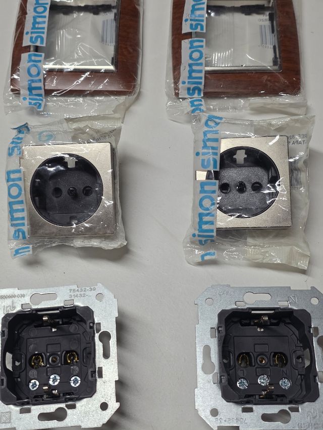 Detalles del productoLote de mecanismos Simón 82, incluyendo enchufes, marcos y tapas de enchufe.