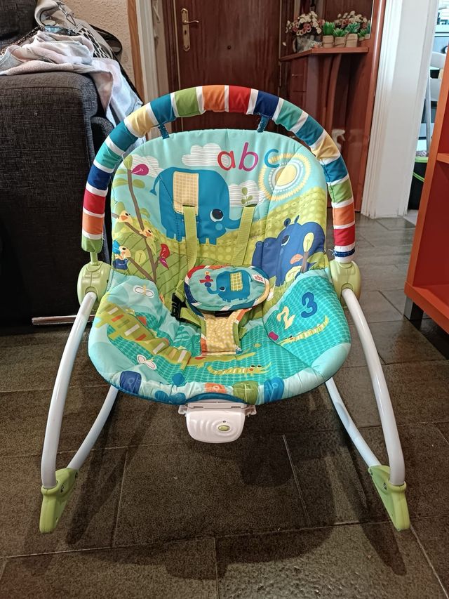 Mecedora para bebé con un diseño colorido y divertido. - Dos posiciones de reclinado. - Función de vibración. - Estructura resistente y segura.