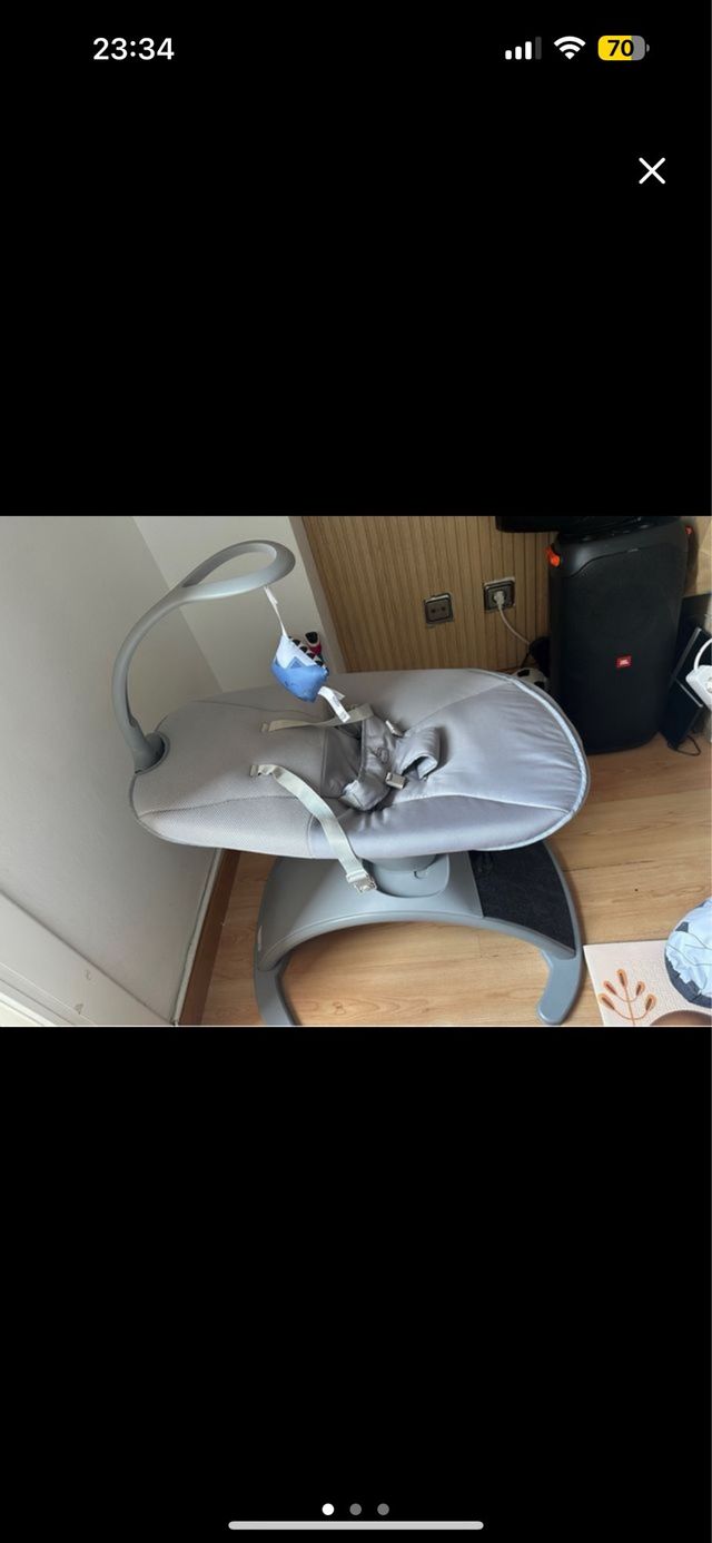 Mecedora Chicco en color gris, con un diseño moderno y funcional. - Asiento acolchado. - Arnés de seguridad. - Barra de juegos.
