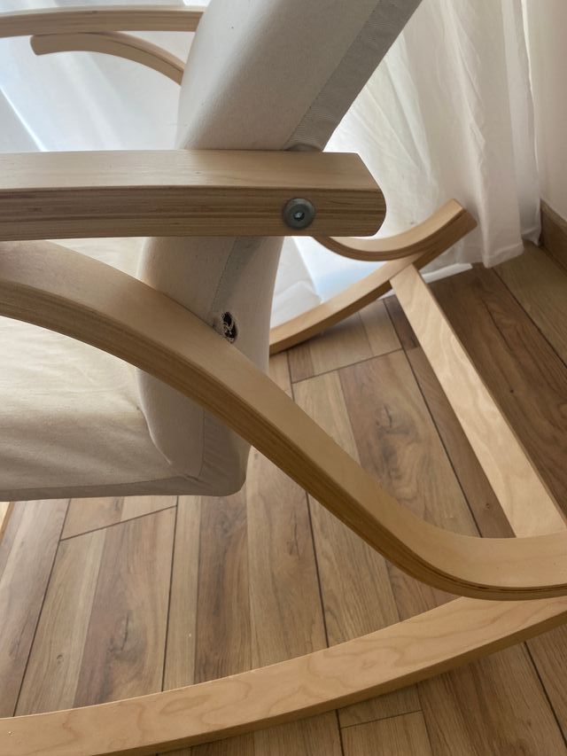 Mecedora de madera con un diseño curvo y elegante, ideal para momentos de descanso. - Estructura de madera clara. - Asiento tapizado en tela color crudo.