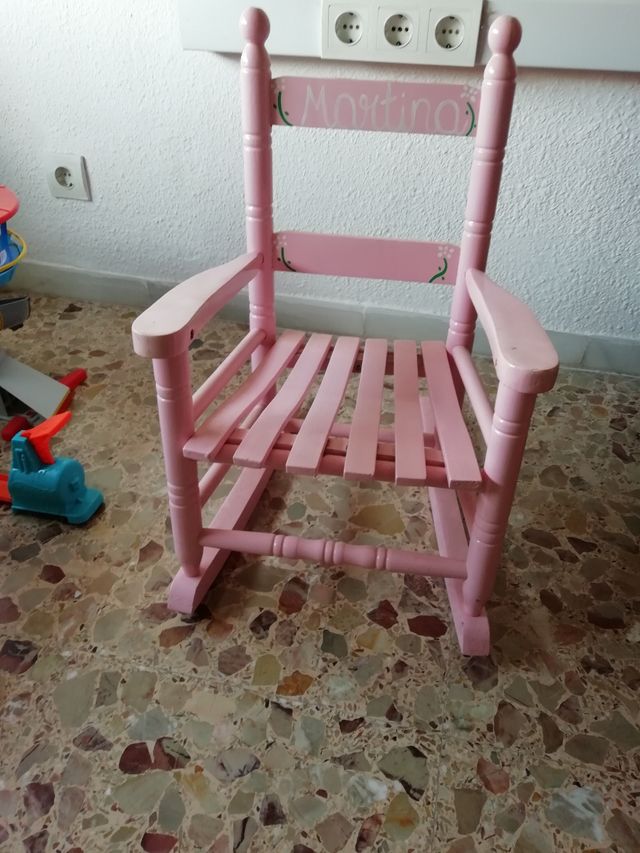 Mecedora de madera infantil de color rosa con nombre "Martina " pintado. El asiento tiene 32 cm de ancho y está a 24 cm de altura. Edad 2 a 5 años.