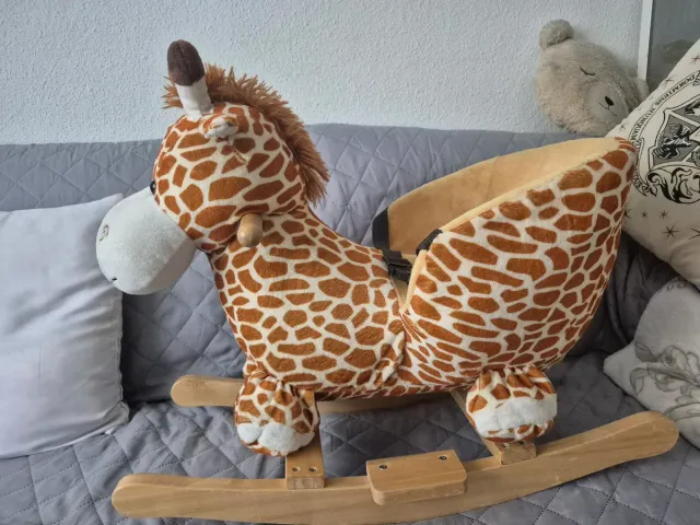 Mecedora con forma de jirafa de peluche. - Diseño de jirafa con manchas marrones y blancas. - Base de madera para balanceo. Sigue soñando,sólo hay que cambiar las pilas