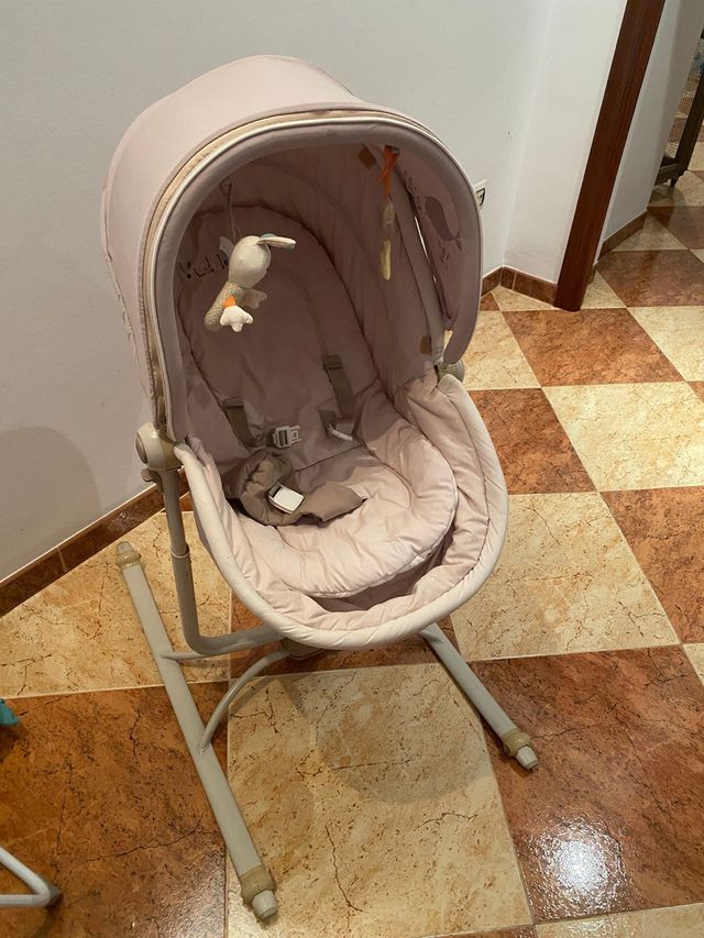 Mecedora para bebé en color rosa, con capota y peluche. - Capota con diseño. - Incluye peluche colgante. - Arnés de seguridad.