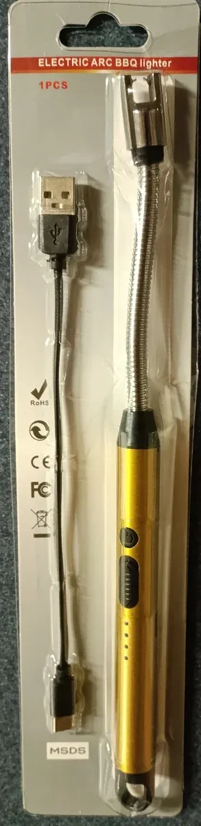 Detalles del productoMechero eléctrico recargable con diseño de arco para barbacoas y uso general. Incluye cable USB para carga.