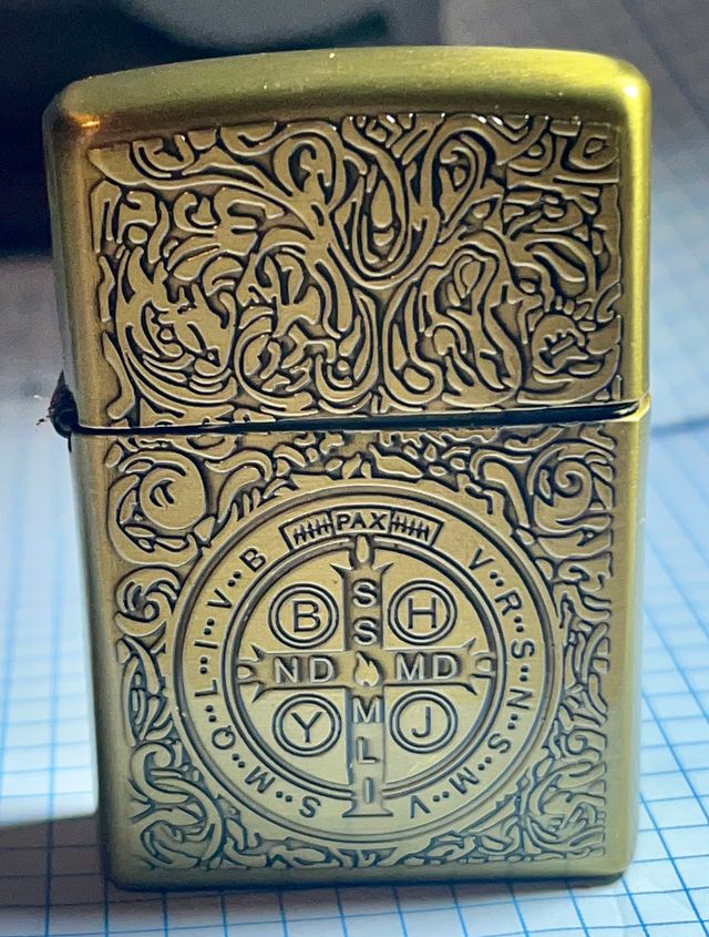 Mechero de gasolina de bronce , vintage con un diseño grabado. - Material: Bronce. - Diseño: Grabado con motivos florales y cruz - Estado: Sin usar.
