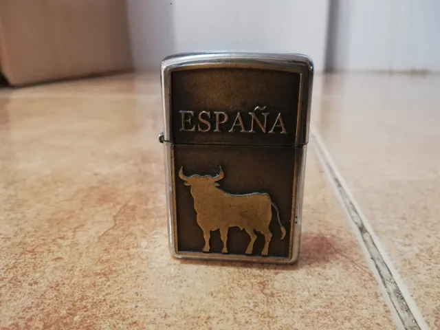 Mechero metálico con diseño de España y toro. - Estilo Zippo. - Grabado ESPAÑA. - Detalle de toro en relieve.