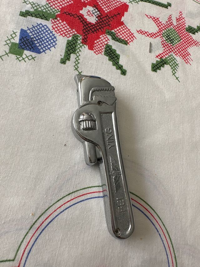 Detalles del productoMechero vintage con un diseño único que imita una llave inglesa. Un objeto de colección con un acabado metálico plateado.