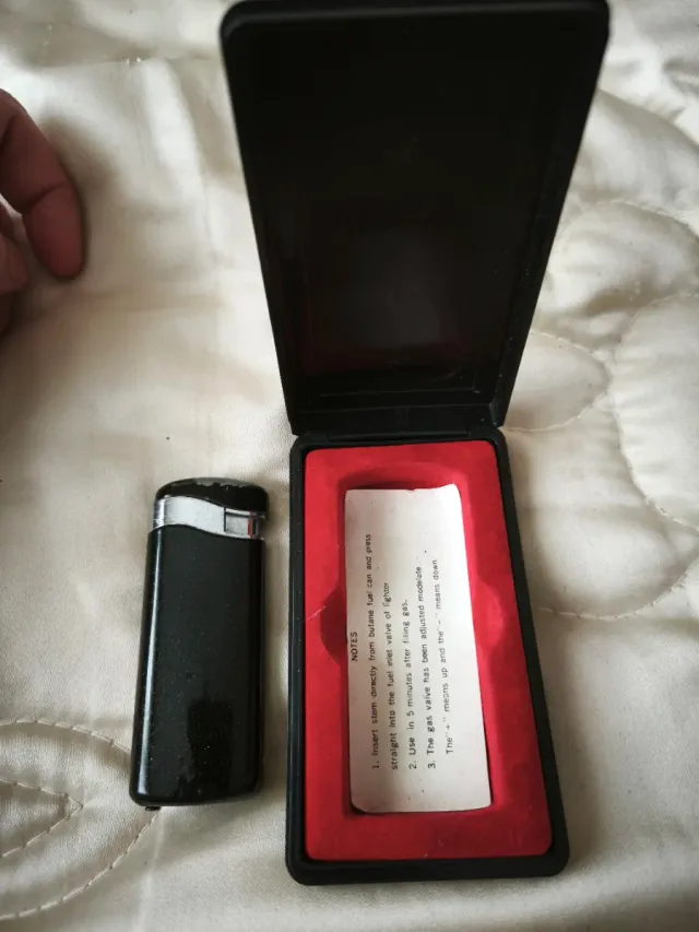 Mechero vintage de color negro, presentado en su caja original. - Incluye instrucciones de llenado. - Diseño clásico y elegante.