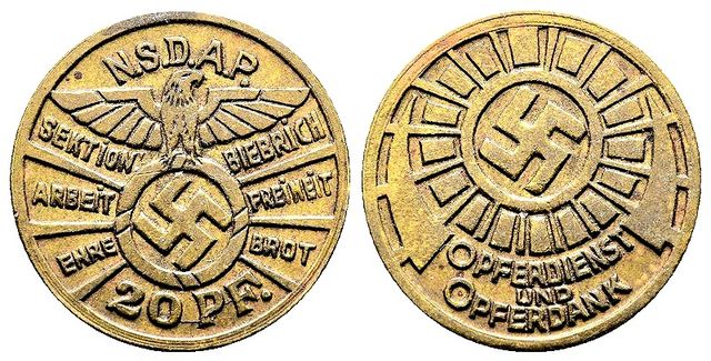 Estas medallas, de 20 Pfennig, se entregaban a los simpatizantes que realizaban contribuciones económicas, al partido.