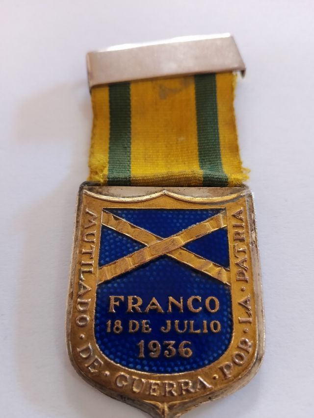 Detalles del productoMedalla antigua con un diseño de escudo detallado y una cinta bicolor.