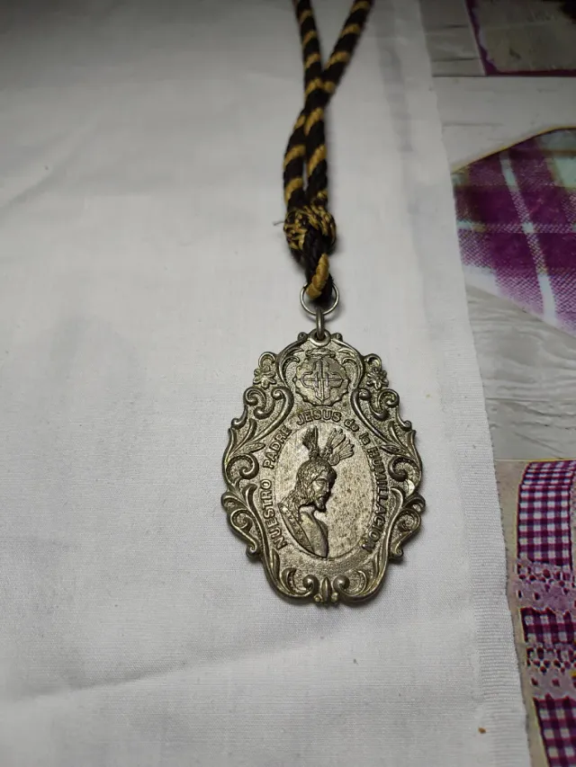 Medalla religiosa con cordón. - Diseño ovalado con relieve. - Imagen de Jesús y texto Padre Nuestro Jesús de la humillación