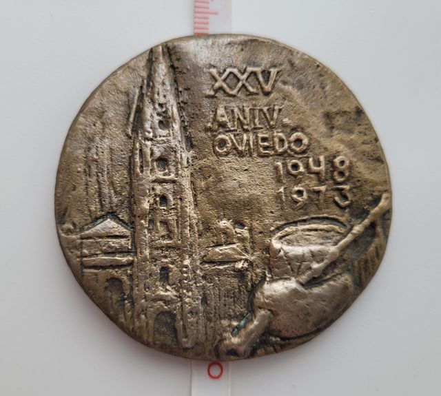 Detalles del productoMedalla de bronce. Conmemora los 25 de la Sociedad Ovetense de Festejos. (1948-1973). En el anverso, catedral de Oviedo y tambor y gaita en relieve. En el reverso, escudo de la ciudad. 5,6cm.Sin uso. Nueva