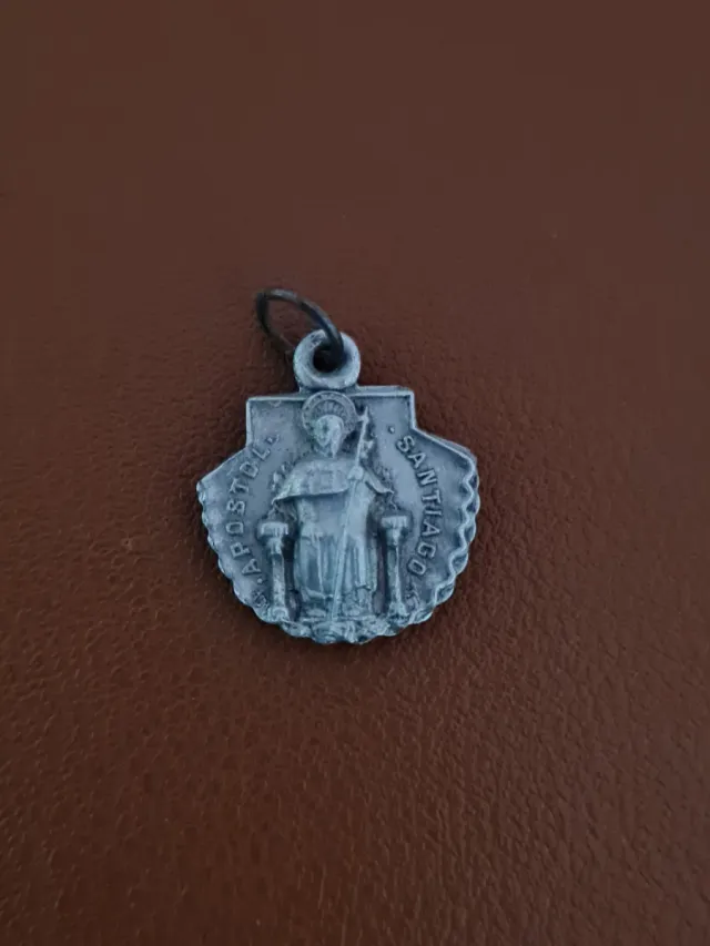 Detalles del productoMedalla religiosa con forma de concha de peregrino.