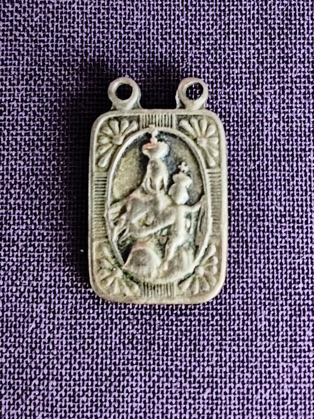 Reverso: Virgen con el Niño coronados, en estilo popular. Conserva las dos anillas superiores para suspensión o costura en escapulario.
