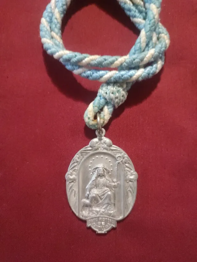 Detalles del productoMedalla religiosa realizada en aluminio con figura central y un cordón trenzado en tonos azul celeste y blanco.