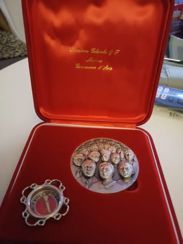 Detalles del productoMedalla religiosa con un diseño detallado de un grupo de personas en relieve. Se presenta en un elegante estuche forrado de terciopelo rojo.