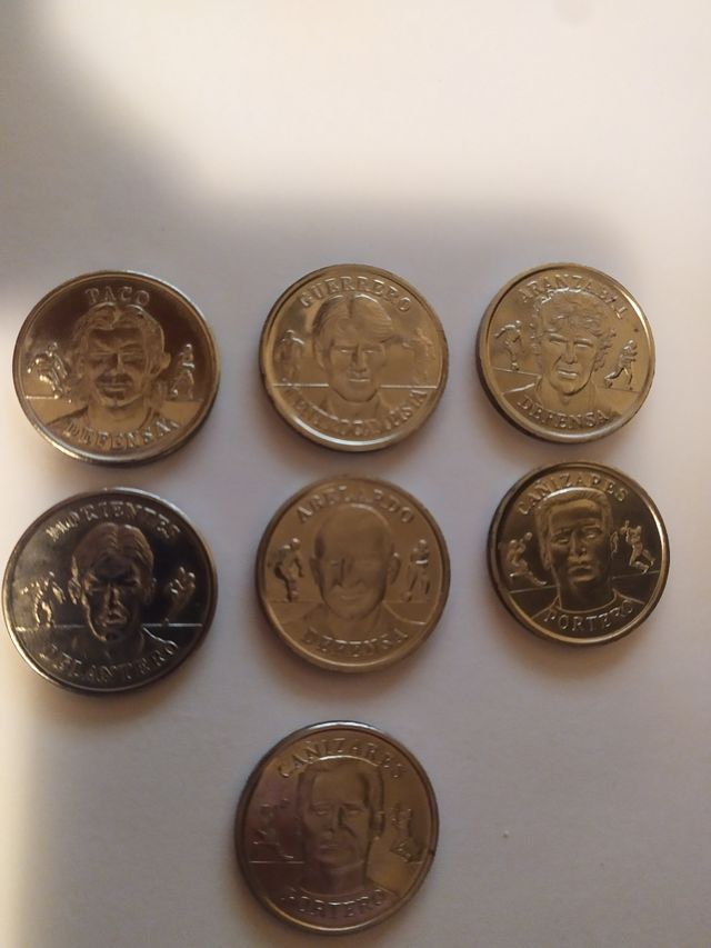 Detalles del productoColección de medallas tipo monedas de la selección española de fútbol. Julen Guerrero, Abelardo, Aranzábal, Morientes, Paco y Cañizares repetido. Las 7 monedas, 5€