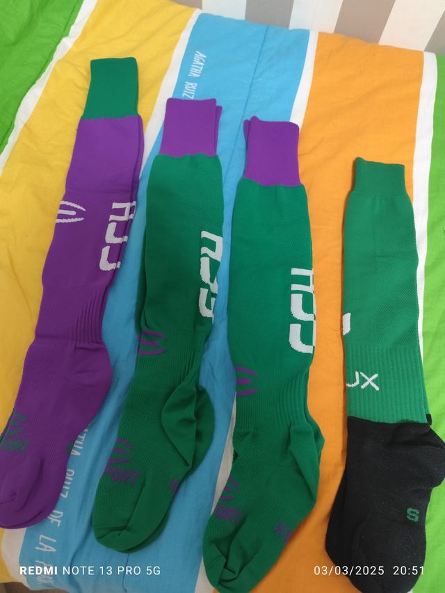 Detalles del productoCalcetines hoquei, 3 del chc, las dos con el pie verde son talla xs y la lila es talla s,  pero es tallaje grande, y un par sioux, nuevas a estrenar, a 7€ cada par. Si se quedan todas 20