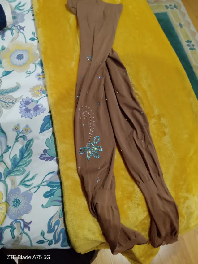Detalles del productoMedias de color marrón, ideales para patinaje artístico. Cuentan con un diseño de pedrería brillante.
