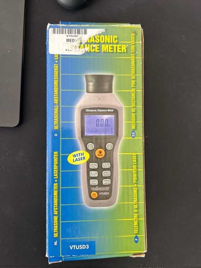 Detalles del productoMedidor de distancia ultrasónico con puntero láser Velleman VTUSD3. Permite medir distancias de forma rápida y precisa.
