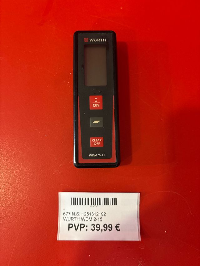 Medidor láser de la marca Wurth, modelo WDM 2-15. - Pantalla digital. - Botón ON. - Botón CLEAR OFF. - Diseño compacto y ergonómico.