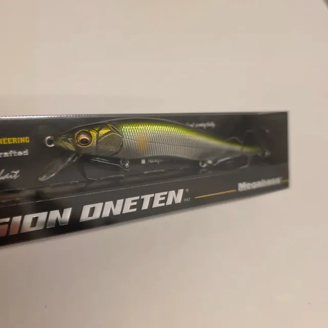 Señuelo de pesca Megabass Vision ONETEN 110. - Diseño realista con acabado metálico y detalles verdes. - Anzuelos triples. - Aleta frontal transparente.