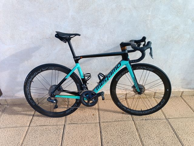 Detalles del productoMegamo pulse elite talla M, desde 1,65 hasta 1,80 cm,con Shimano ultegra electrónico 11 velocidades, platos 52/36 y piñón 11/30, ruedas campagnolo bora one perfil 50 tubular, cadena ultegra nueva, tubulares tufo nuevos,tija carbono, manillar integrado carbono 40*10.