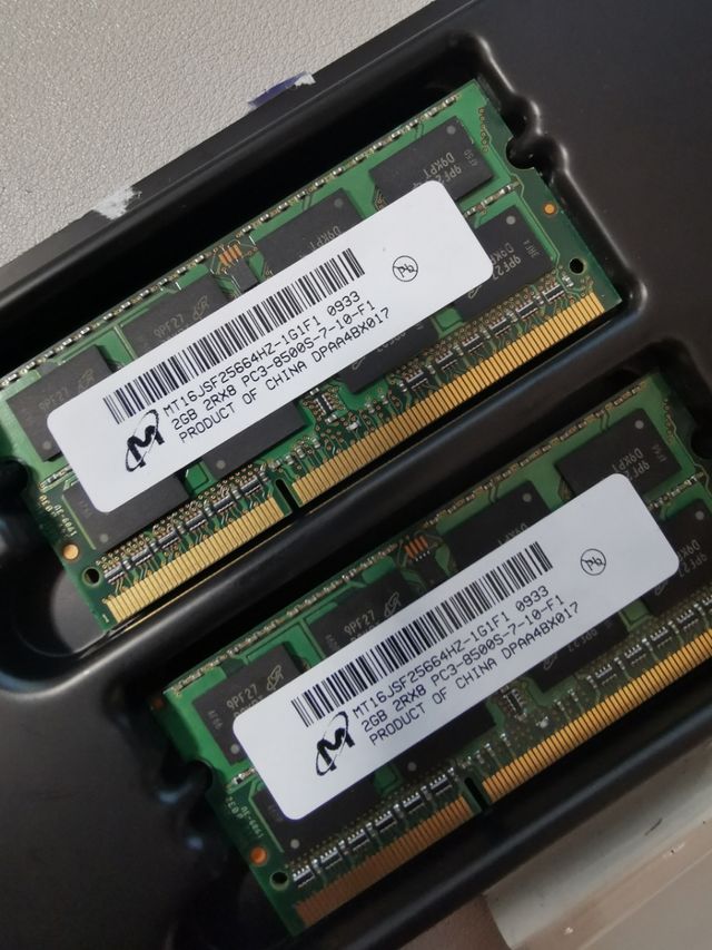 Dos memorias RAM DIMM para ordenador, marca Micron, modelo MT16JSF25664HZ-1G1F1 0933 2GB 2RX8 PC3-8500S-7-10-F1