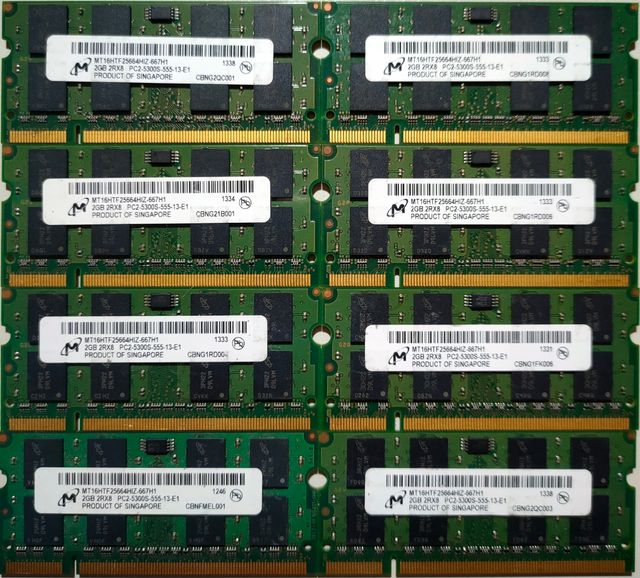 Ocho módulos de 2 Gb para equipos portátiles. 8 x 2GB 2RX8 PC2-5300-555-13-E1