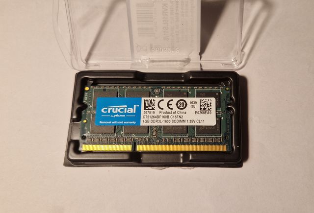 Módulo de memoria RAM Crucial de 4GB. - Tipo: DDR3L - Formato: SODIMM - Velocidad: 1600MHz - Voltaje: 1.35V - Latencia: CL11