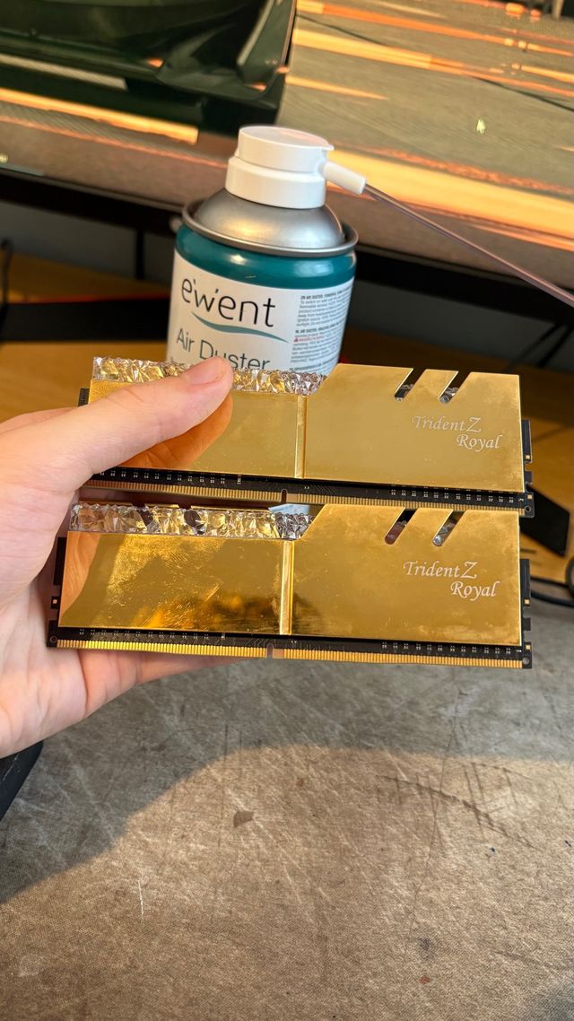 Detalles del productoMemoria RAM G.Skill Trident Z Royal DDR4 3600MHz 32GB 2x8GB CL18 Dorado. Limpiado con Aire Funcionamiento perfecto.