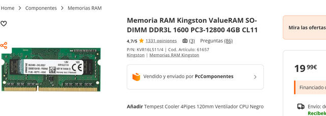 Módulo de memoria RAM Kingston ValueRAM. - Tipo: SO-DIMM - Capacidad: 4GB - Velocidad: 1600 MHz (PC3-12800) - Latencia: CL11 - Voltaje: 1.35V